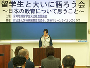 平成19年11月17日(土)、宮崎大学で「留学生と大いに語ろう会」が「日本の教育について思うこと」というテーマで開催されました (主催:宮崎地域留学生交流推進協議会、共催:財団法人宮崎県国際交流協会、宮崎マリーンライオンズクラブ)。