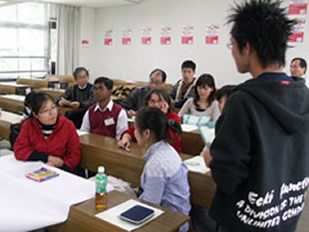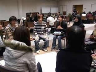 平成20年12月13日(土)、宮崎公立大学で「留学生と大いに語ろう会」が「日本で生活する上で、外国人が不便だと思うこと」というテーマで開催されました (主催:宮崎地域留学生交流推進協議会、共催:財団法人宮崎県国際交流協会、宮崎マリーンライオンズクラブ)。外国人留学生、日本人学生及び県内の一般の方など約50名が参加し、留学生の意見発表や日本人学生、来場者の方との意見交換や交流会が行われました。