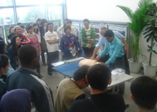 留学生を含む在住外国人やボランティアが参加し、南海トラフ地震など今後宮崎県が直面する可能性のある災害についての講話の後、少人数のグループに分かれて日本赤十字社による応急手当の説明や消防士による通報訓練などを体験しました。特に一昨年発生した東日本大震災の様子を動画を交えて紹介した際は参加者からどよめきが起き、震災の恐ろしさを再確認する機会となりました。
