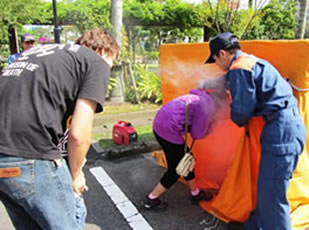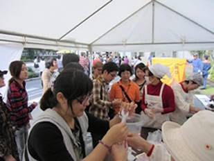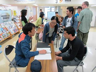 留学生を含む在住外国人やボランティアなどが参加し、語学別のグループに分かれて起震車による地震体験、火災の煙体験、炊き出し体験、消防士による講話、赤十字奉仕団による毛布・風呂敷を使った避難所での過ごし方の紹介がありました。今年3月に発生した東北地方大震災の影響もあってか、早くから申込みをする人もあり、感心の高さが伺えました。阪神淡路大震災や東北地方大震災時に外国人に対し十分な対応ができていなかったことをふまえ、今回は“やさしい日本語”または“多言語標記”を使用し、炊き出しや保存食に関しては出身地域や宗教に配慮し行いました。