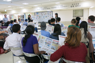 留学生を含む在住外国人やボランティアが参加し、多文化共生マネージャー全国協議会事務局長の時光氏による、災害時にとるべき行動に関する講演の後、宮崎県国際交流協会より、避難所や防災グッズなど災害に関する基礎的な知識の説明がありました。