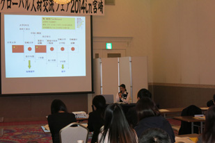 同日午後は、宮崎県が主催する「グローバル人材活用セミナー&交流会」がニューウェルシティ宮崎で開催された。このセミナーでは、九州企業におけるグローバル人材活躍事例の講演や、宮崎大学を卒業して宮崎銀行に就職した元留学生の陶 婉悠 (トウ エンユウ)氏による就職体験発表が行われた。また、海外展開を視野に入れる企業13社との交流会では、仕事の内容や企業が求める人材について熱心に質問する留学生の姿がみられた。